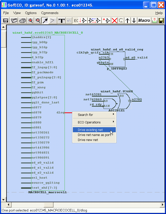 - The port 'dlog' should replace U3460 to drive n2765. So select the pin, mouse-right-click to pop up menu and select 'Drive existing net'.